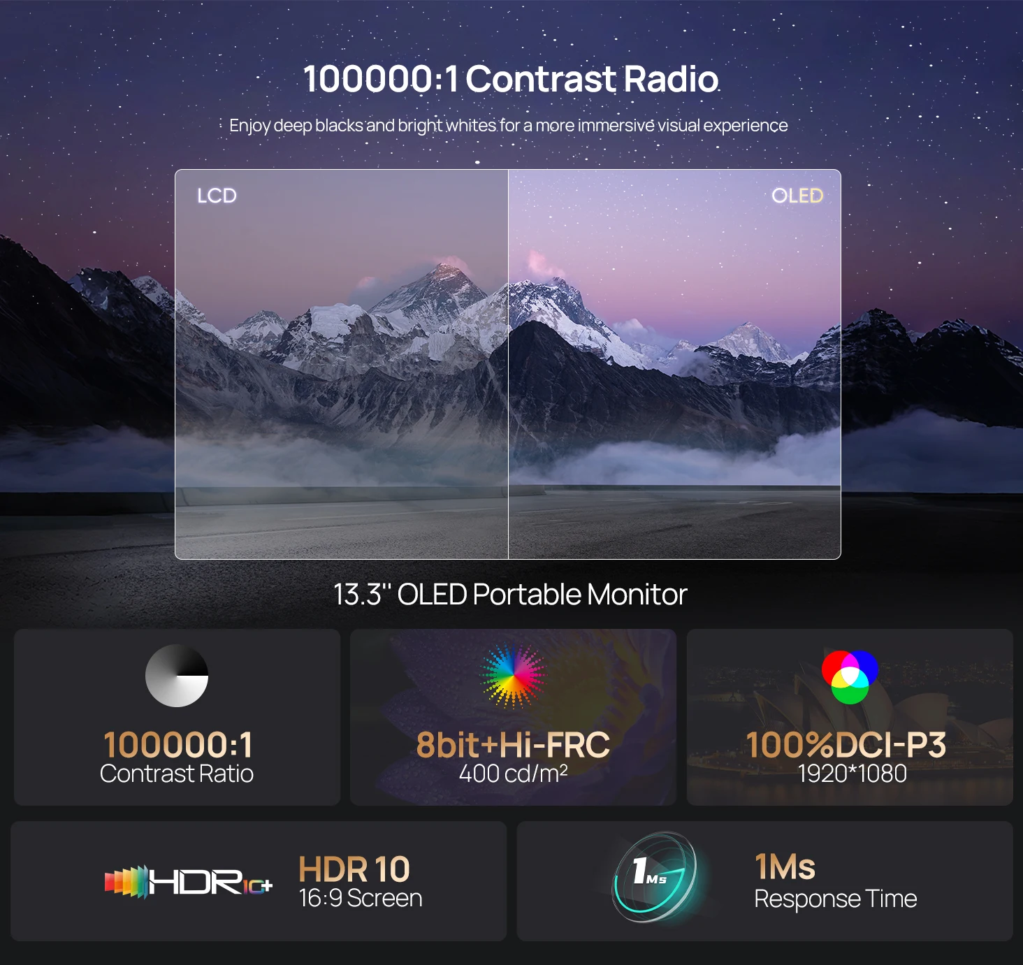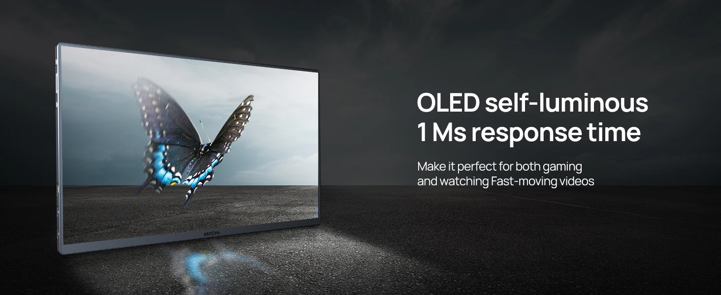The ARZOPA A3C Pro 13.3" OLED portable monitor delivers stunning FHD visuals with 100% SRGB – perfect for work or entertainment on the go!